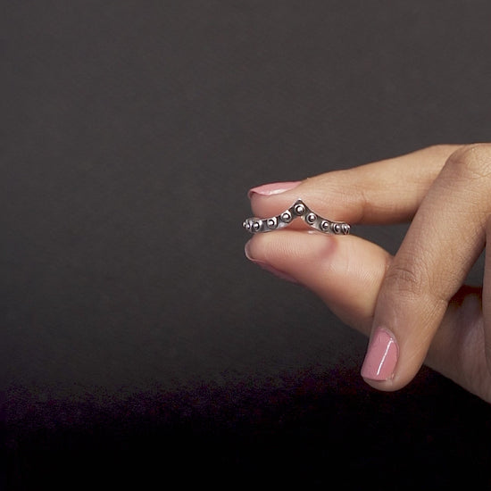 Inspired by the sacred "Shakti" symbol of strength and focus, this V-shaped chevron ring is a masterclass in traditional Indian silver craft. Handcrafted using the meticulous Rawa technique—where individual silver beads are fused onto the band—its oxidized finish creates a deep contrast that highlights every intricate detail of the heritage metalwork.