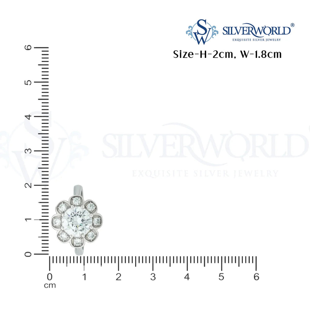 Exude timeless elegance with this dazzling floral diamond ring by Silver World, crafted in premium 925 sterling silver. At its heart lies a brilliant round-cut central stone, surrounded by a halo of smaller sparkling stones arranged in a delicate flower shape. Perfectly balanced between sophistication and charm, this ring is a versatile accessory for both everyday wear and special occasions.