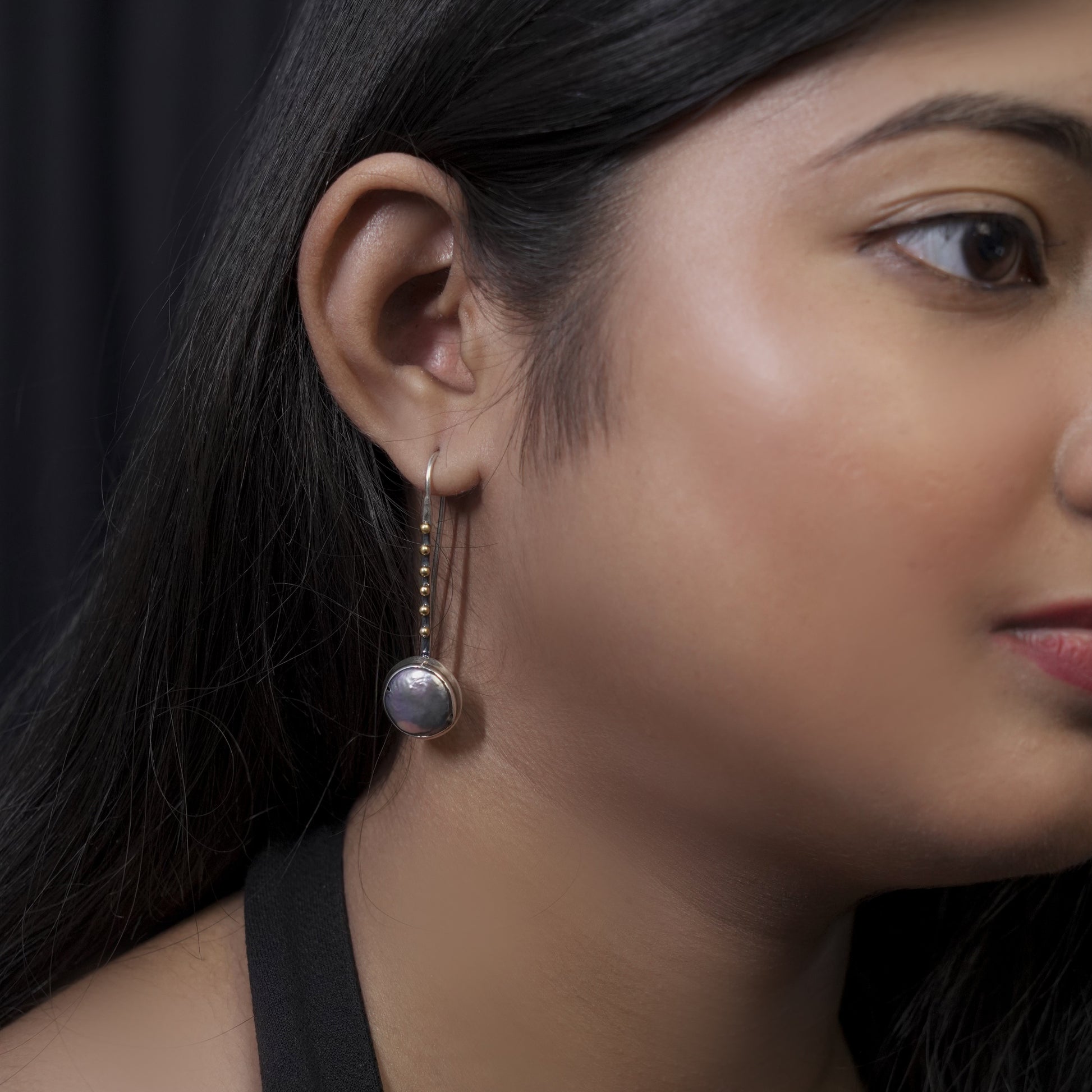 [Heritage Story] Inspired by the ethereal glow of a moonlit ocean, these Luminous Gray Moon-Drop Danglers celebrate the rare beauty of natural button pearls. Each earring features a hand-selected gray pearl with a rich, iridescent luster, suspended from a slender silver hook adorned with delicate gold-plated tribal beads. Handcrafted in pure 925 silver with a sophisticated oxidized finish, they embody a "Modern Heirloom" aesthetic that bridges royal tradition with contemporary minimalism.