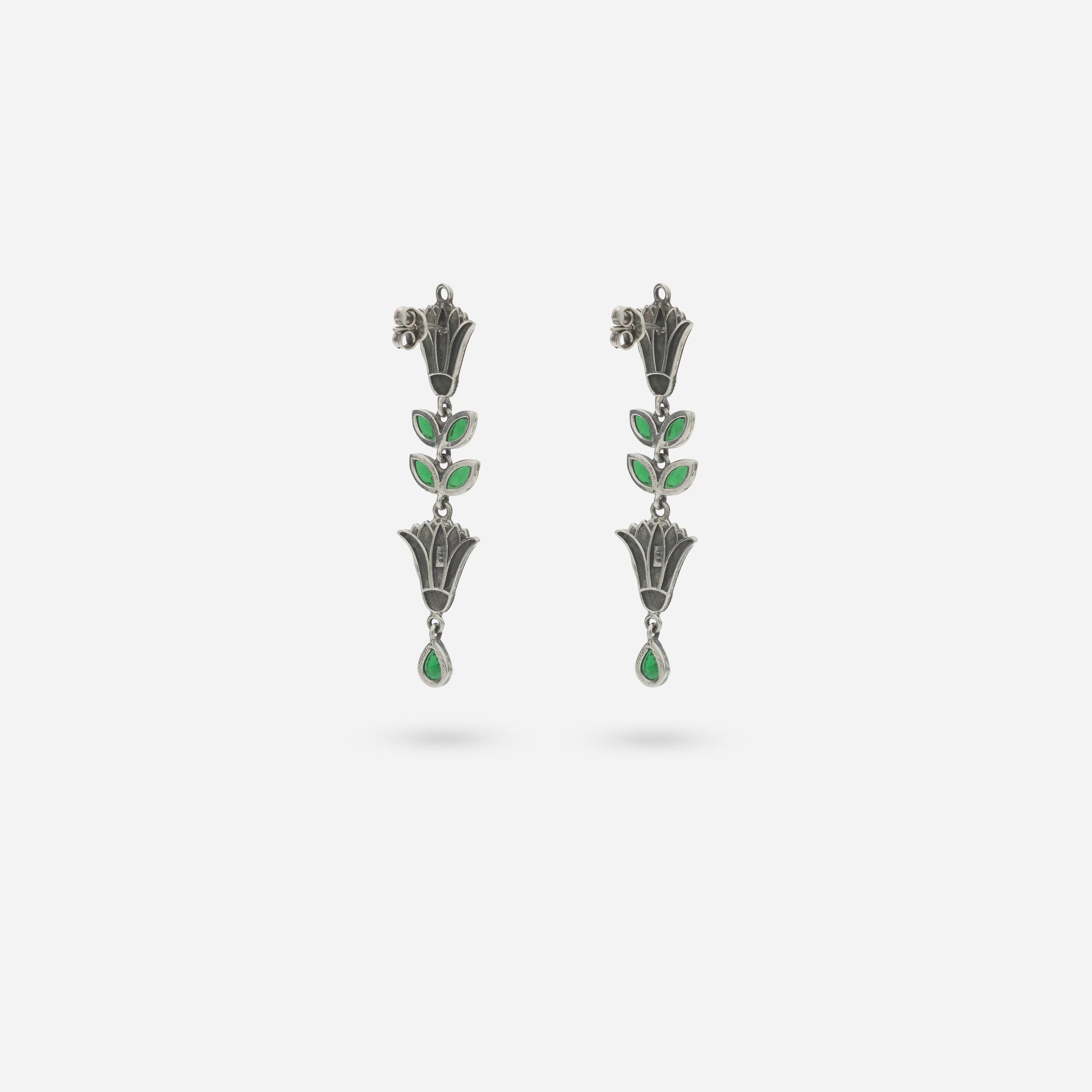 Inspired by the lush, blooming vines of ancient Indian royal gardens, these drop earrings capture the spirit of natural grace. Each earring features a sequence of tiered floral motifs set with vibrant green stones that reflect the verdant beauty of the monsoon. Handcrafted in pure silver with a sophisticated oxidized finish, they embody a "Modern Heirloom" aesthetic that bridges traditional artistry with contemporary style.