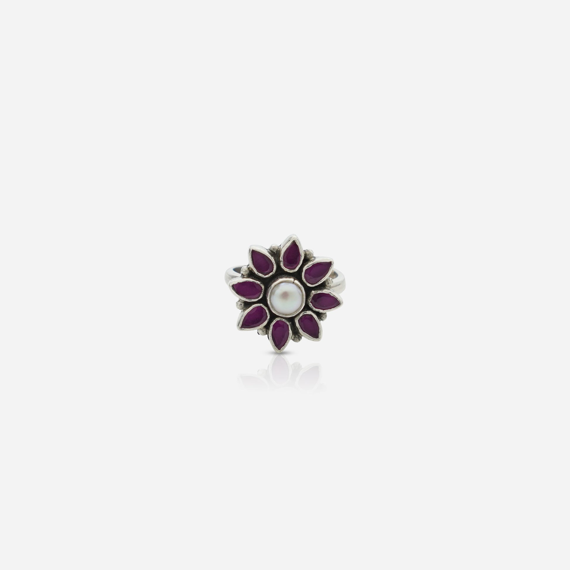 [Heritage Story] Inspired by the blooming lotus ponds of royal Indian courtyards, this ring celebrates the harmony of light and color. At its heart lies a polished, Luminous Moon-Drop pearl, symbolizing lunar serenity and grace. It is encircled by a radiant crown of ten teardrop-shaped pink zirconia stones, creating a "Modern Heirloom" that captures the festive spirit of traditional craftsmanship.