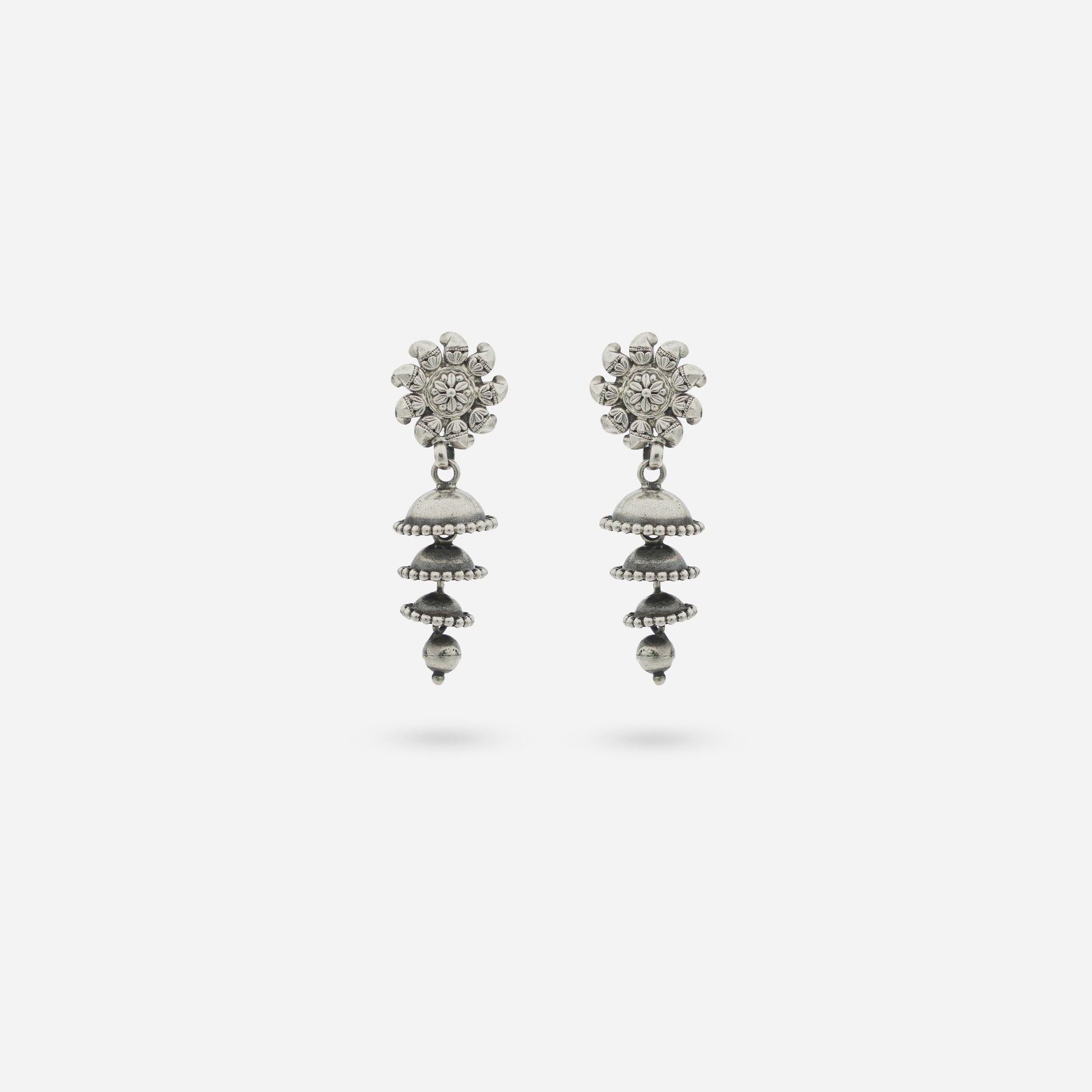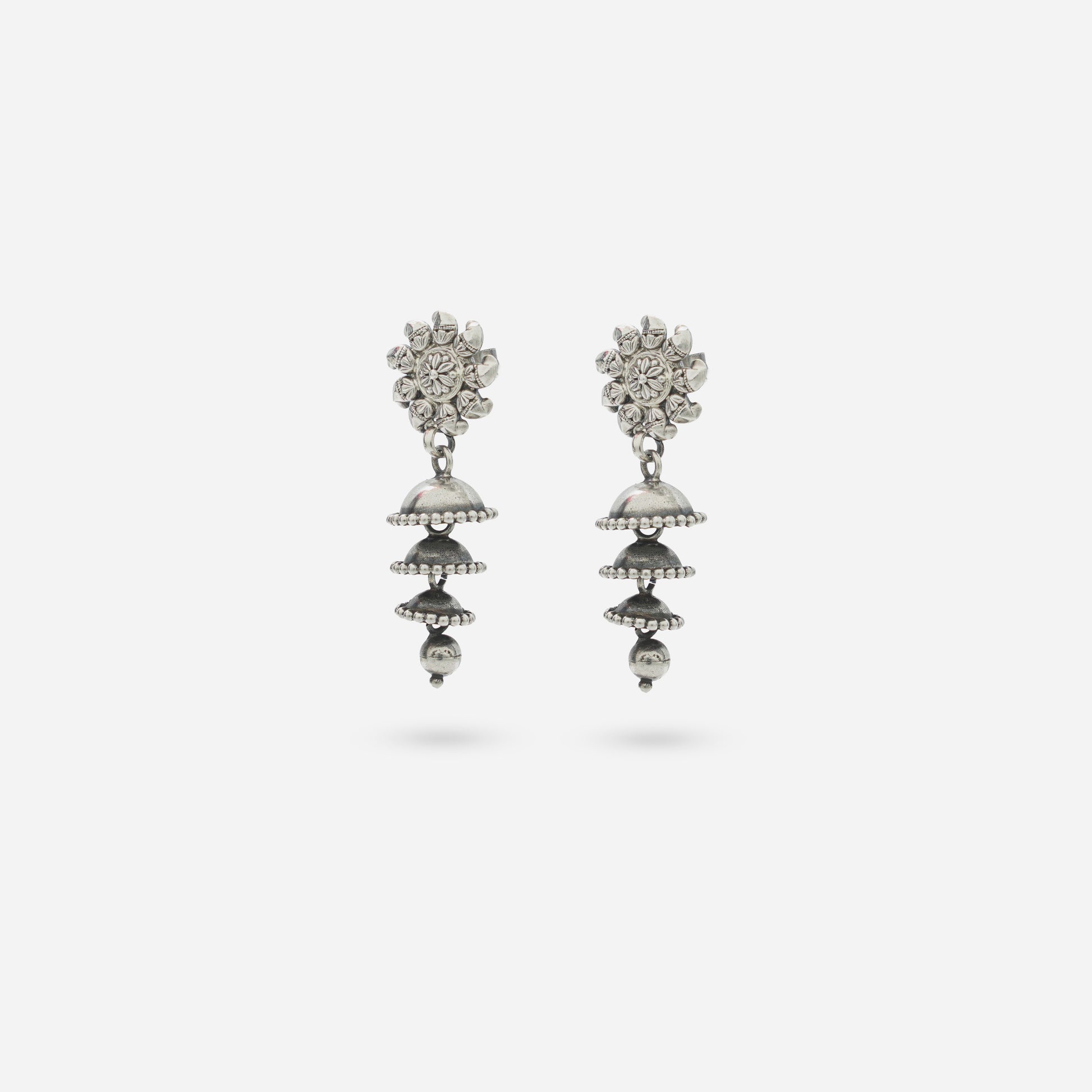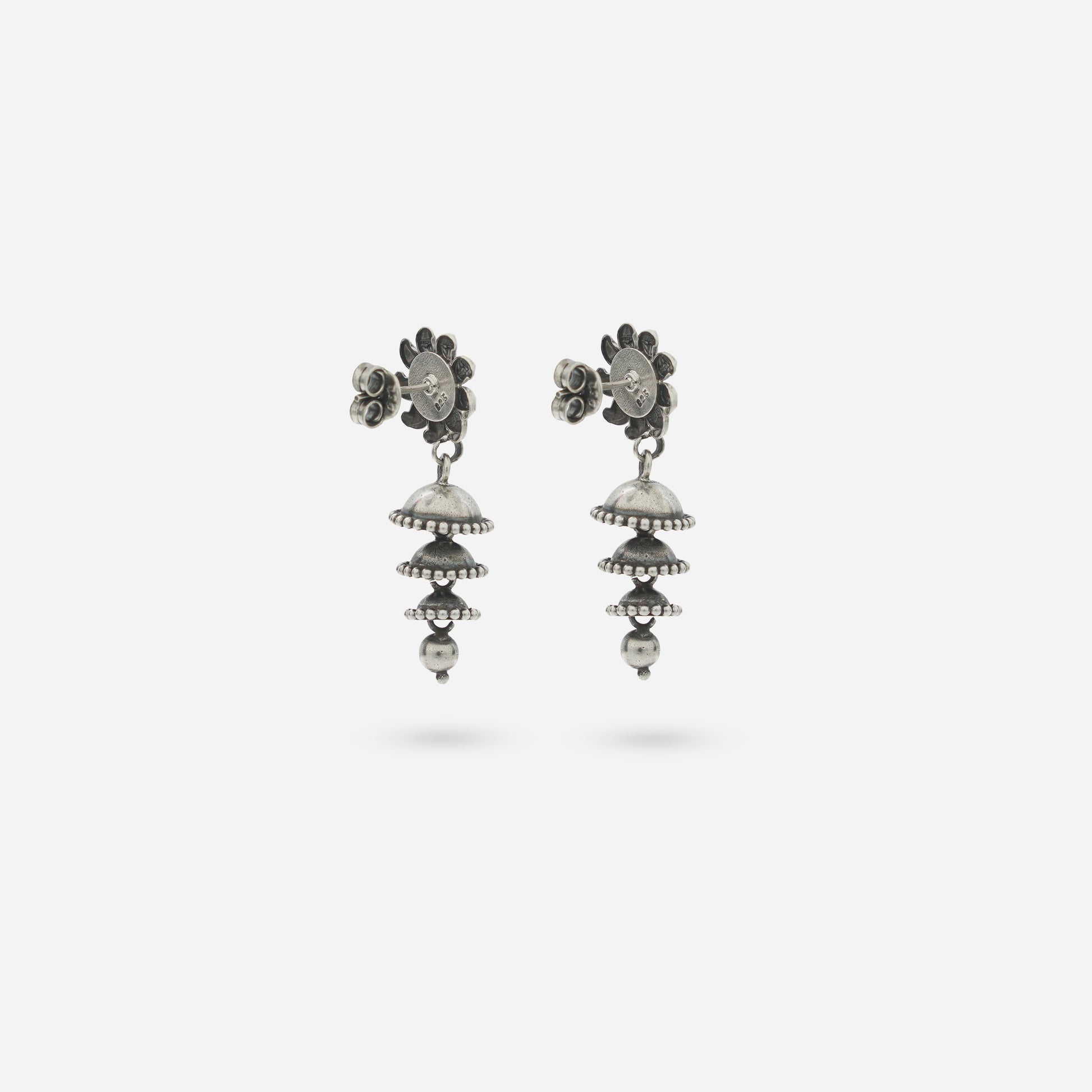Inspired by the multi-layered "Panch-Lari" or stepped jewelry of Indian royalty, these earrings are a tribute to traditional architectural grandeur. Each tier of the bell (Jhumka) is meticulously handcrafted in pure silver, leading down to a final spherical drop. The floral-engraved stud acts as a blooming foundation for this rhythmic cascade of silver, finished with a soulful oxidized patina that evokes the spirit of a "Modern Heirloom."