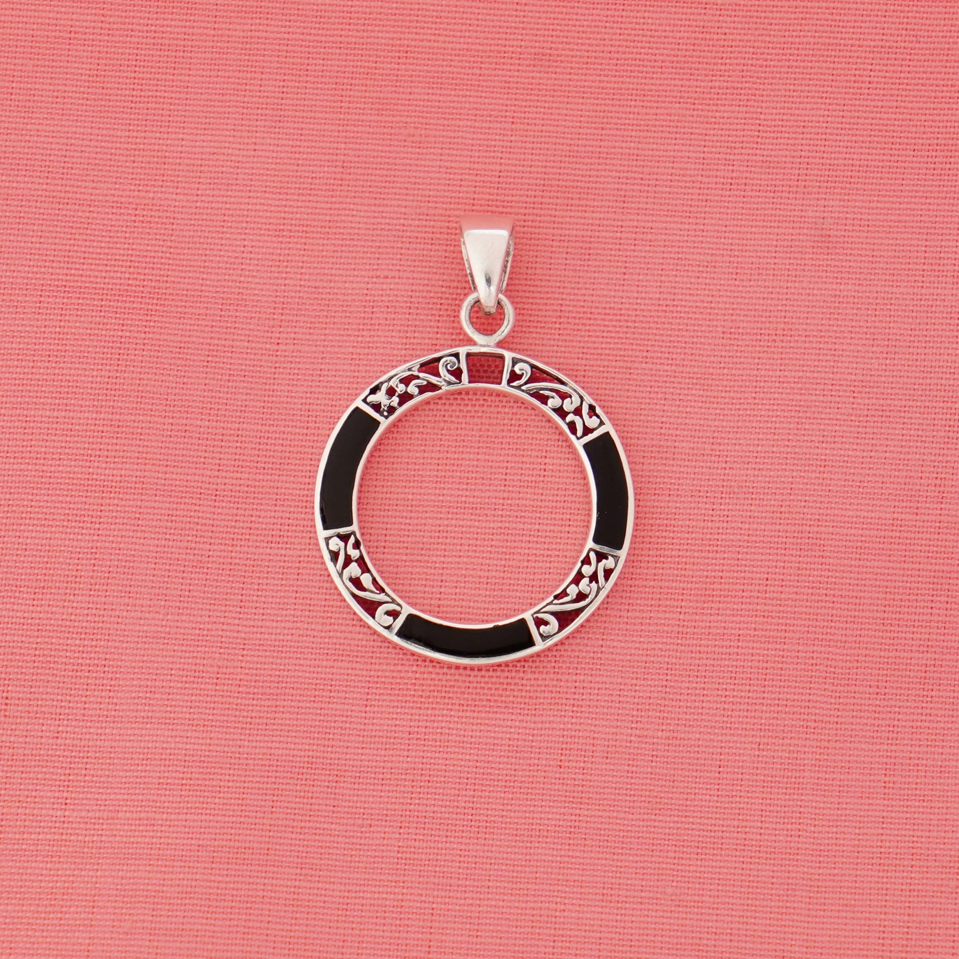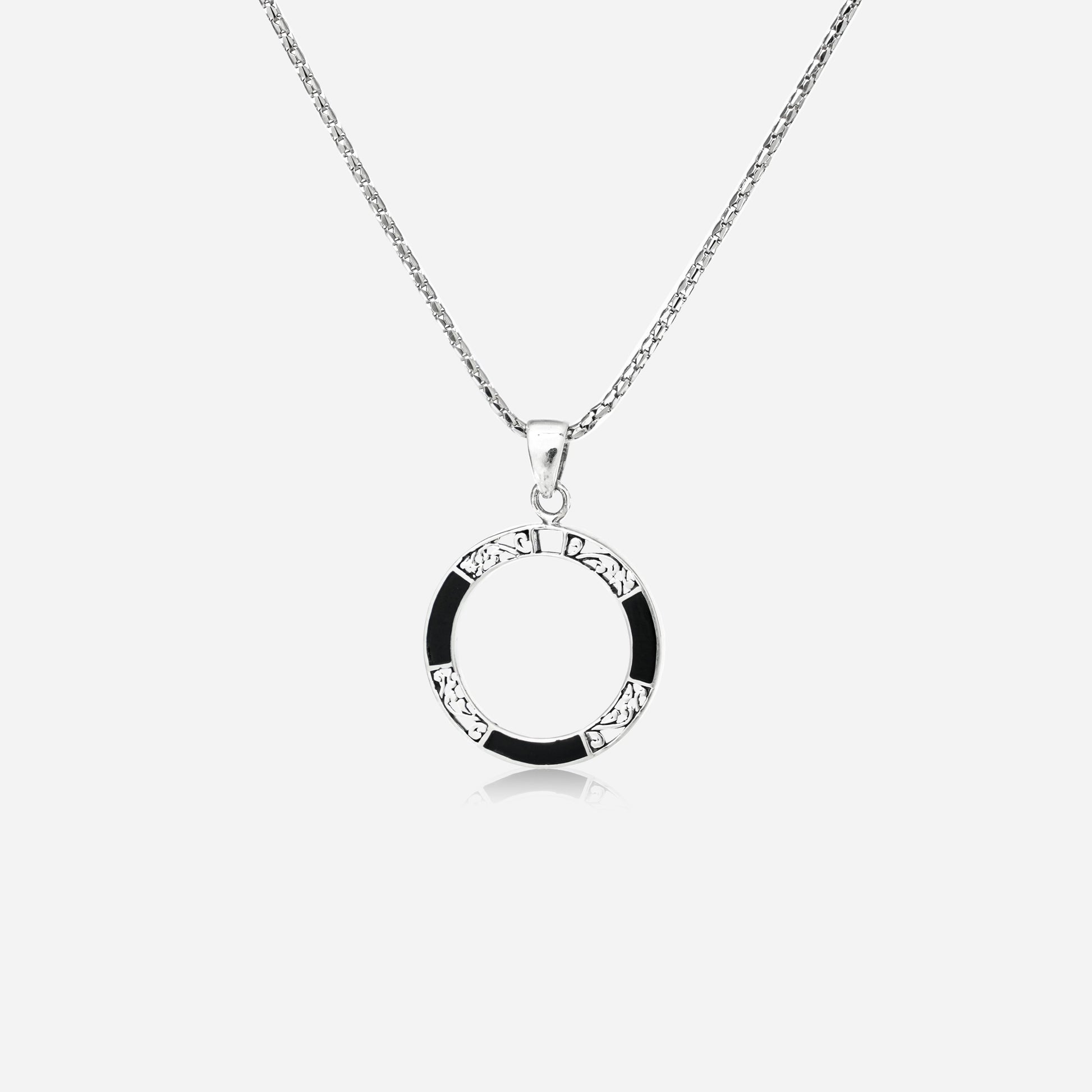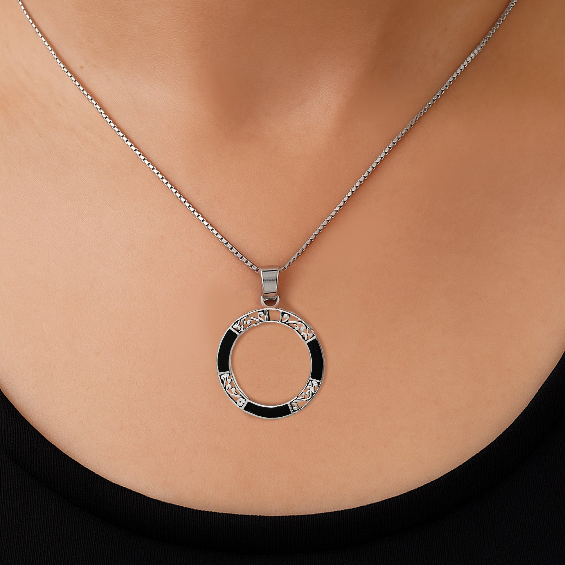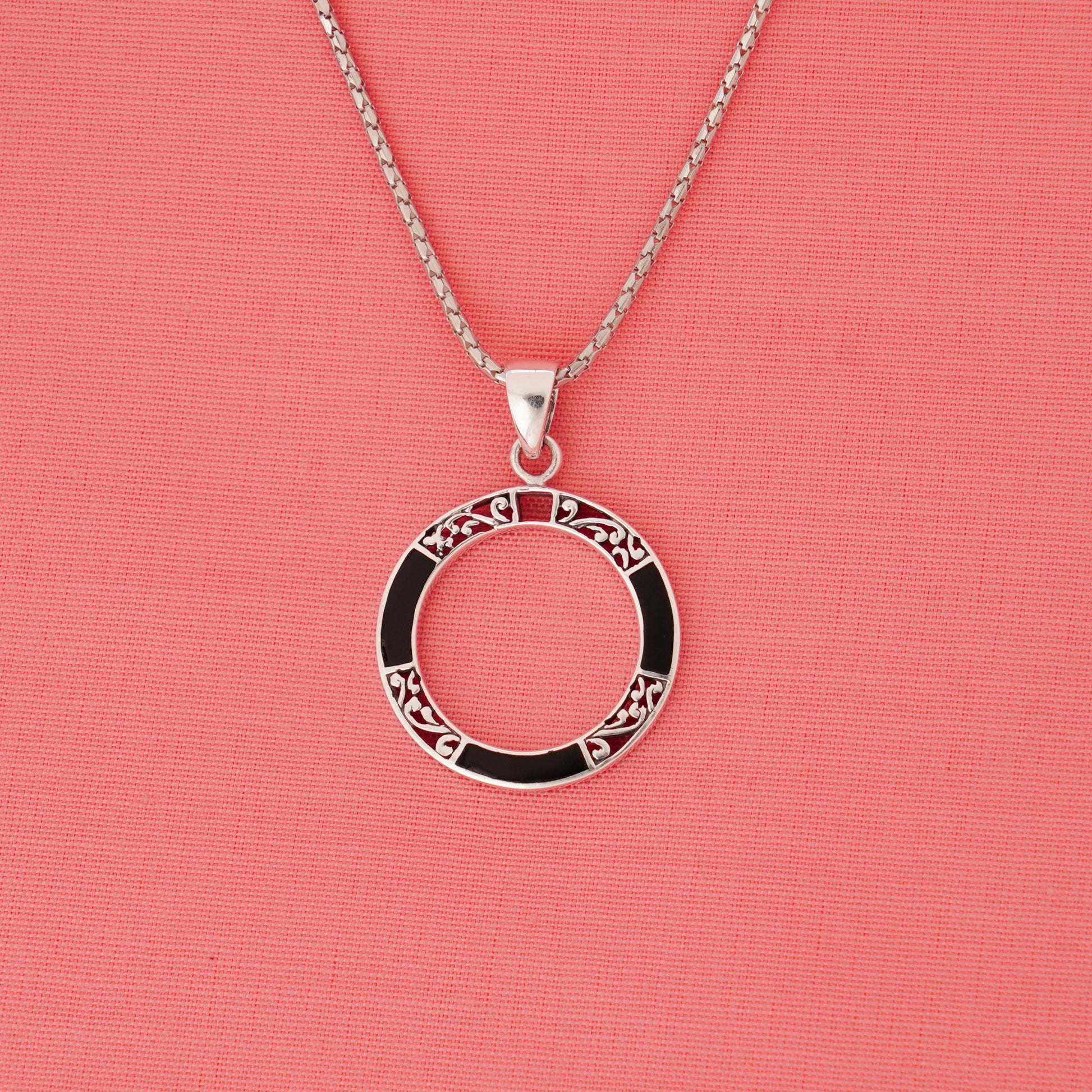 Elevate your elegance with Silverworld’s Sterling Silver 925 Noir Circle Pendant. This sophisticated pendant features a bold circular frame with alternating glossy black enamel and ornate silver filigree segments. The balanced openwork design offers a modern, minimal appeal while highlighting traditional craftsmanship.