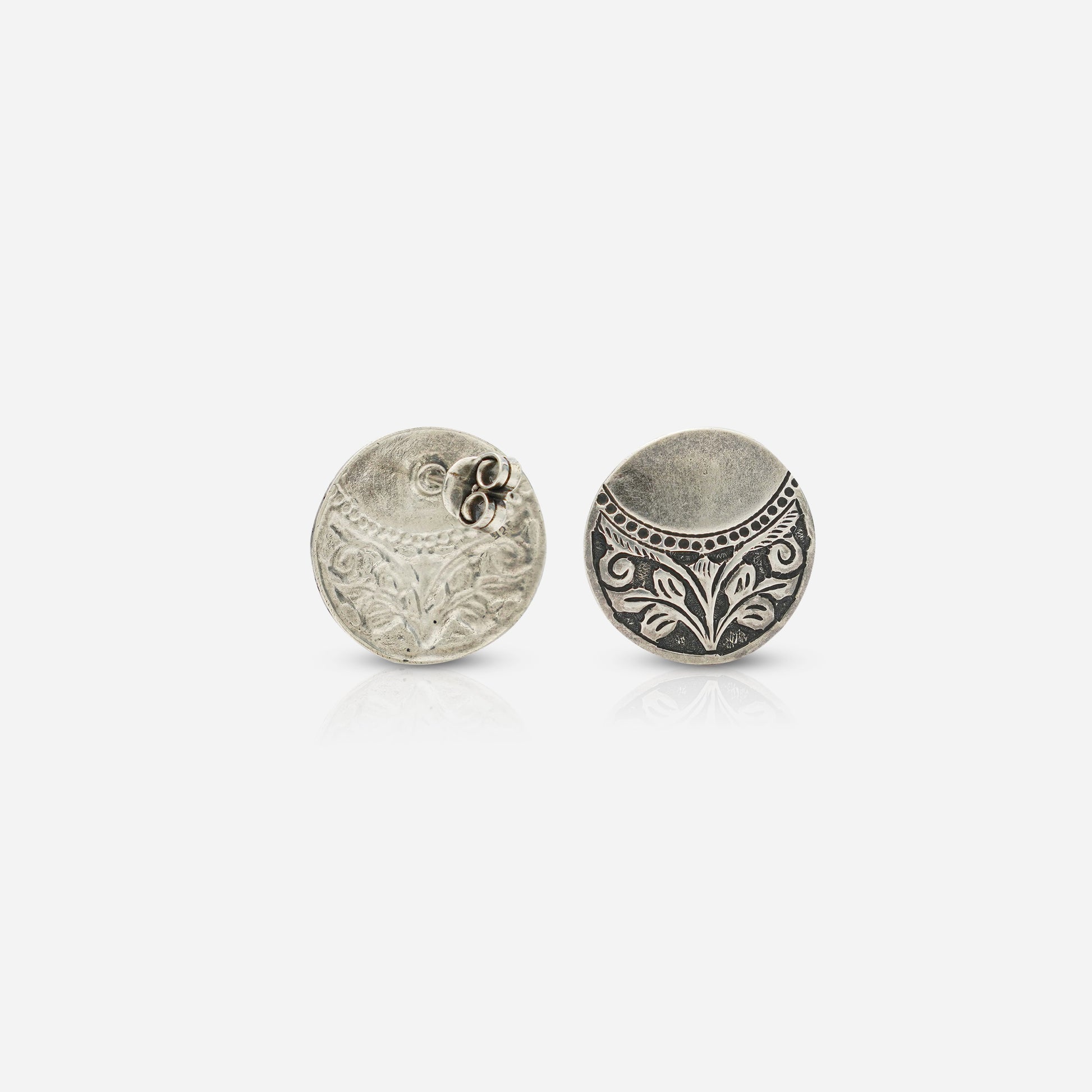 Inspired by the ancient ornamental seals of the Indian subcontinent, these Tribal Medallion Studs are a tribute to the art of storytelling through silver. Each circular stud is meticulously handcrafted in pure 925 silver, featuring deep-etched floral vines and scalloped patterns that symbolize growth and continuity. Finished with a soulful oxidized patina, they offer a vintage, "Modern Heirloom" aesthetic for the contemporary woman.